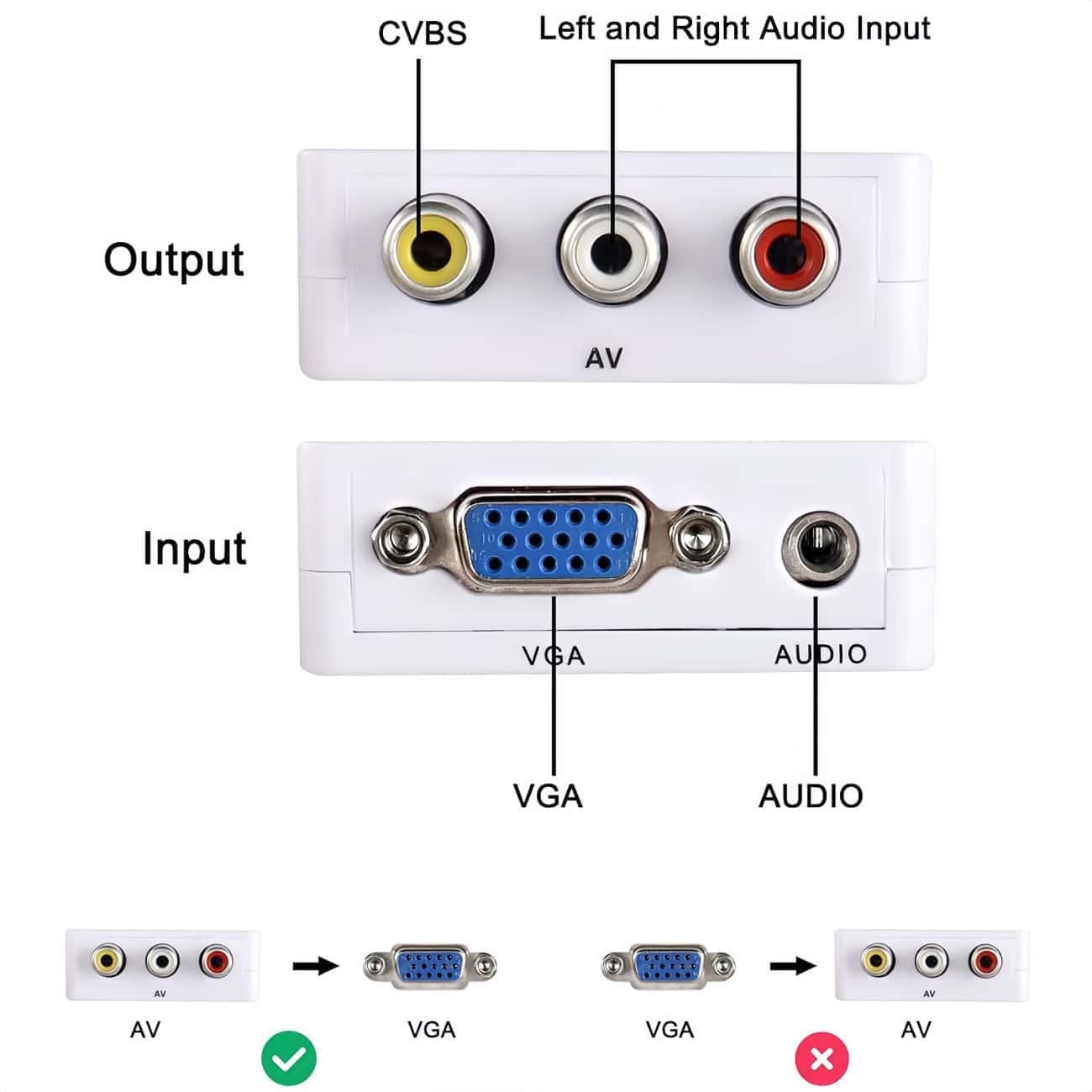 2. Conversion Function: CVBS AV (RCA) to VGA, with 3.5mm audio transmission.