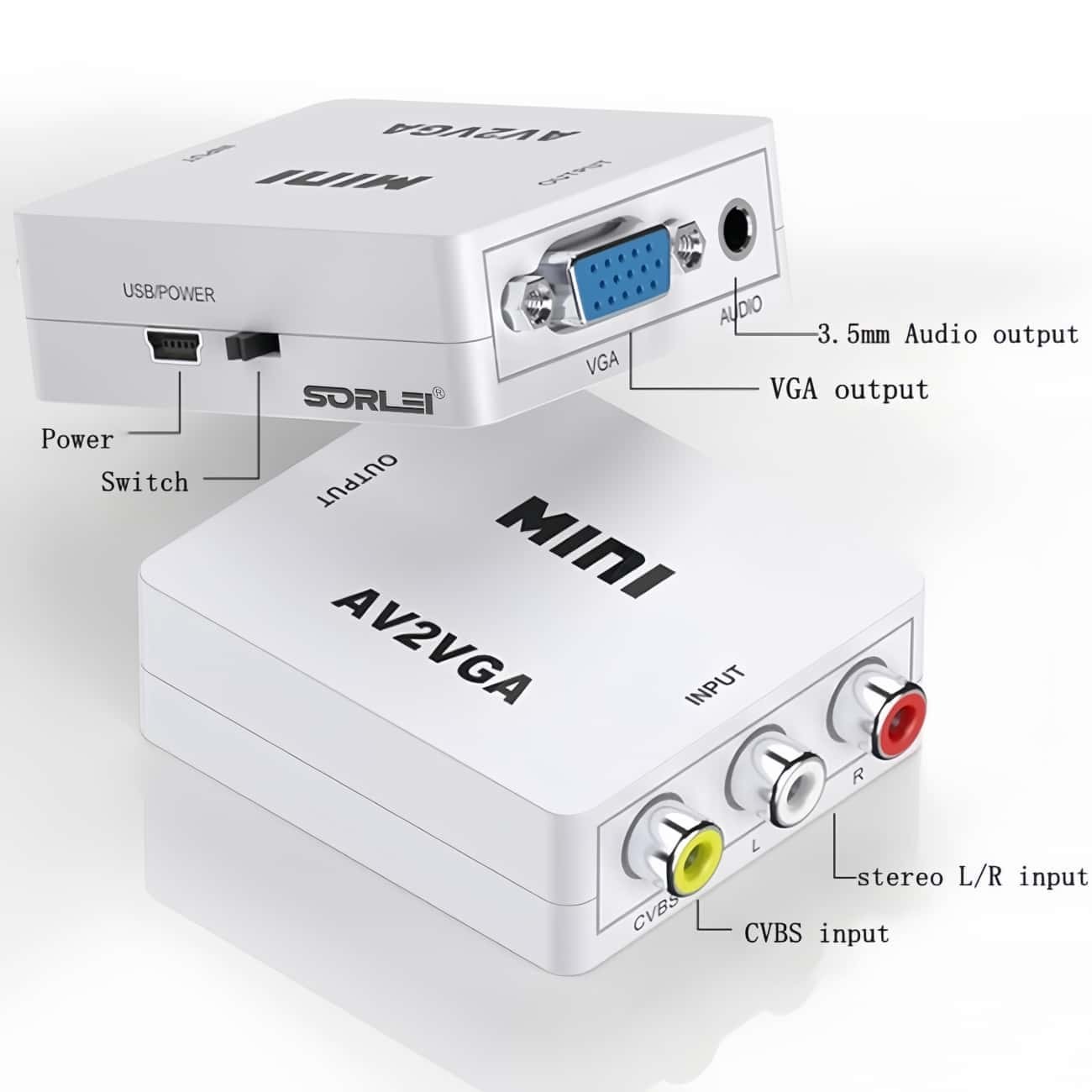 3. Input Ports: 1×RCA (AV) (CVBS), 1×3.5mm Audio Jack.